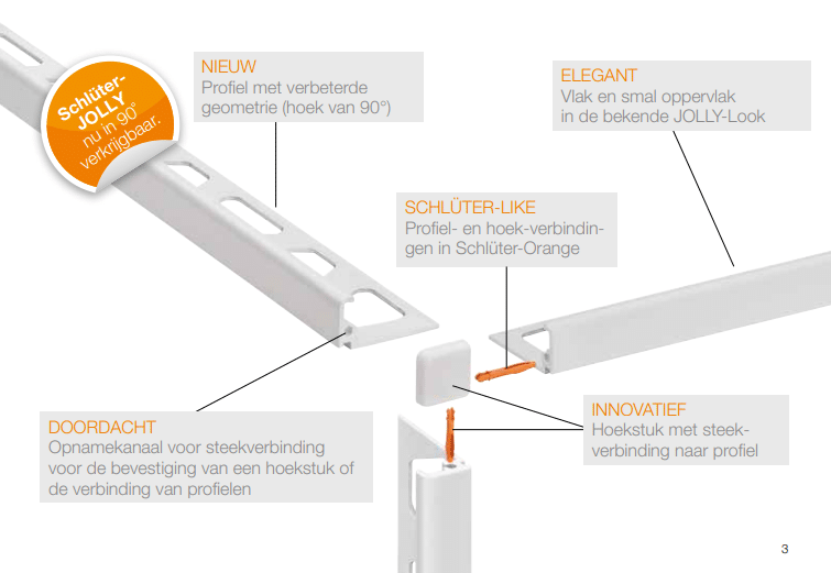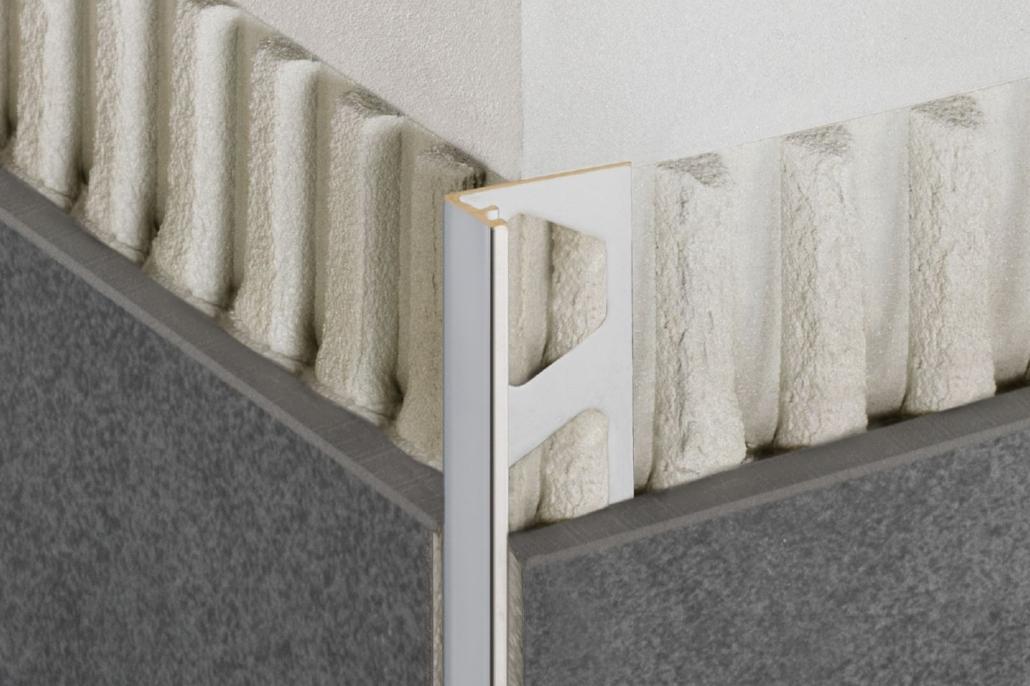 Schlüter-JOLLY TS is een hoogwaardig decoratief structuur-gecoat aluminium 90° afsluitprofiel voor uitwendige hoeken in wandbetegeling en biedt een goede randbescherming. De haakse geometrie van het profiel vormt een mooie afsluiting van de tegelbekleding. De profielen zijn verkrijgbaar in verschillende materialen, kleuren en oppervlakteafwerkingen, zodat u de kleur van de uitwendige hoeken kunt afstemmen op de kleur van de tegels en de voegen, of voor interessante accenten kunt zorgen in de decoratieve vormgeving.